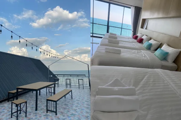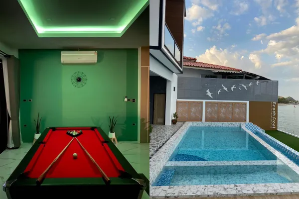 Beachfront พลูวิลล่าแสมสาร Beachfront พลูวิลล่าแสมสาร เป็นตัวเลือกที่ดีแน่นอนหากคุณกำลังมองหาที่พักดีๆ เพราะด้วยวิวทะเลสวยๆ ลมพัดเย็นสบาย บรรยากาศสุดยอดเยี่ยม มีความเป็นส่วนตัวที่พักตกแต่งด้วยสไตล์นอร์ดิก ดูดีมีสไตล์ บอกเลยเซลฟี่กันกระจาย โดดเด่นทุกมุมมองทั้งวิวห้อง วิวด้านหน้า วิวดาดฟ้า สิ่งอำนวยก็พร้อมมาก แบบมากจริงๆ ครบทุกอย่างที่ควรมี ทำให้ทริปท่องเที่ยวผ่านไปได้อย่างยอดเยี่ยม รูปแบบที่พัก ห้องขนาด2คน1ห้องห้องขนาดกลาง2ห้องห้องขนาดใหญ่1ห้องห้องน้ำมีทั้งหมด 5 ห้อง สิ่งอำนวยความสะดวก โต๊ะพลูสระว่ายน้ำคาราโอเกะเครื่องปรับอากาศโทรทัศน์ตู้เย็นกาต้มน้ำร้อน ไมโครเวฟไดร์เป่าผมWifiเครื่องทำน้ำอุ่นเตาปิ้งย่างแบบอย่างดีอุปกรณ์สำหรับทำอาหารที่จอดรถ ภาพบรรยากาศ สถานที่ตั้ง ที่อยู่ : 33 ถนน โยธาธิการ ชลบุรี 2077 ตำบล แสมสาร อำเภอสัตหีบ จังหวัดชลบุรี 20180 Google Map : Beachfront พลูวิลล่าแสมสาร ข้อมูลติดต่อ Facebook : Beachfront พลูวิลล่า แสมสาร Tel : 064-642-6492 กลับหน้ารวมที่พัก (เข้าชมที่พักอื่นๆ)